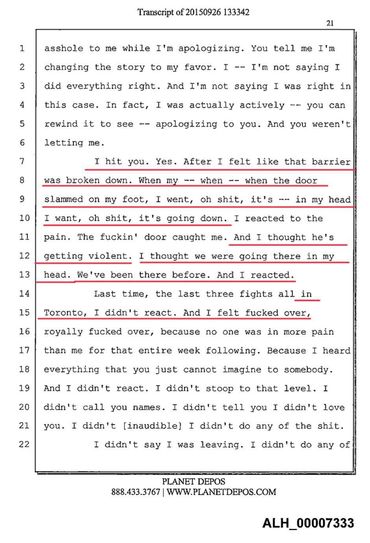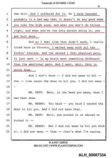 Dr. Anderson testified that Amber had reported to her that Johnny had slapped her, hit her in the head, kicked her in the leg, and pulled her by the hair leaving her with bruises. The judge excluded this part of the testimony yet included the portion of testimony when Dr. Anderson repeated Depp's words that "Amber gave as good as she got". Another example of inconsistent and prejudicial rulings on evidence. Amber has never denied that she hit Depp but her doing so was only after years of sustained abuse and largely in self defense. Dr. Anderson was allowed to testify that in her opinion it was mutual but not about the beatings Depp gave her. It's extremely suspicious that during joint sessions Depp was wholly uncooperative but immediately after Amber filed the TRO he scheduled a solo visit where he reported Amber gave as good as she got. This was no doubt an attempt to do damage control on the impending accusations to make it appear as if the abuse was equal. Even still, she testified that she saw bruises in photos and in person on Amber which the jury ignored.